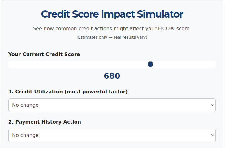 Many free calculators only look at one factor at a time. This simulator combines the four biggest score influencers that people actually control: